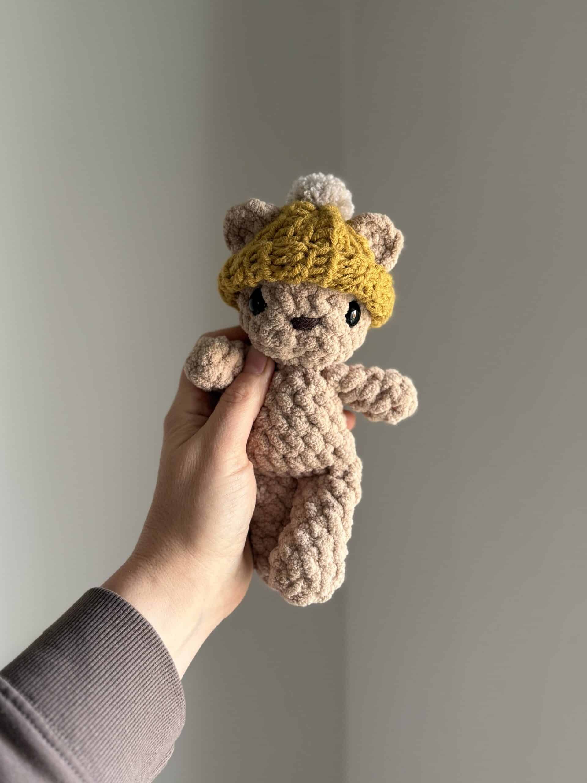 Finn Bear looks so cute in his little beanie! You can leave the beanie as is, or continue to pom pom instructions for an added finishing touch!