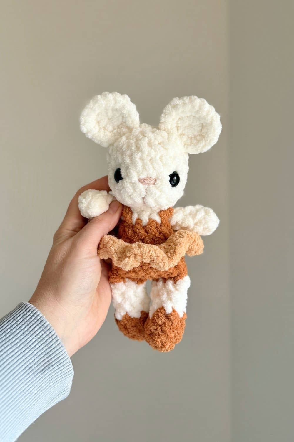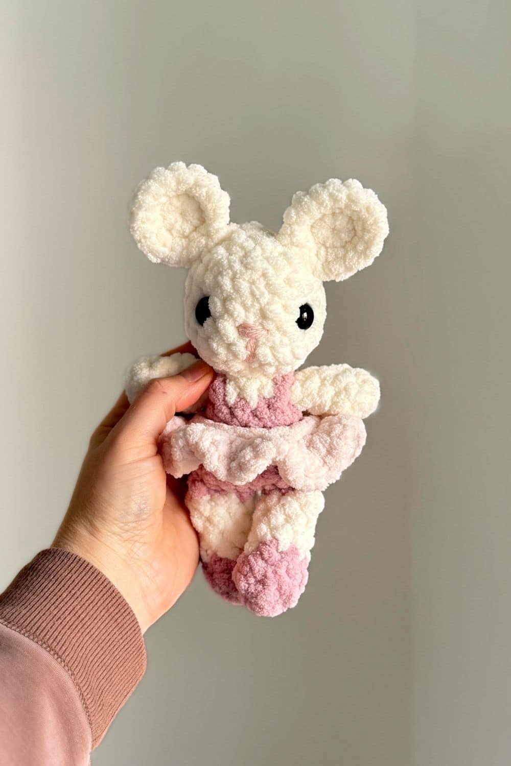 This adorable BABY ballet mouse crochet pattern is perfect for little hands and quick market makes! This pattern is made using plush blanket yarn, creating a soft and huggable finished toy.