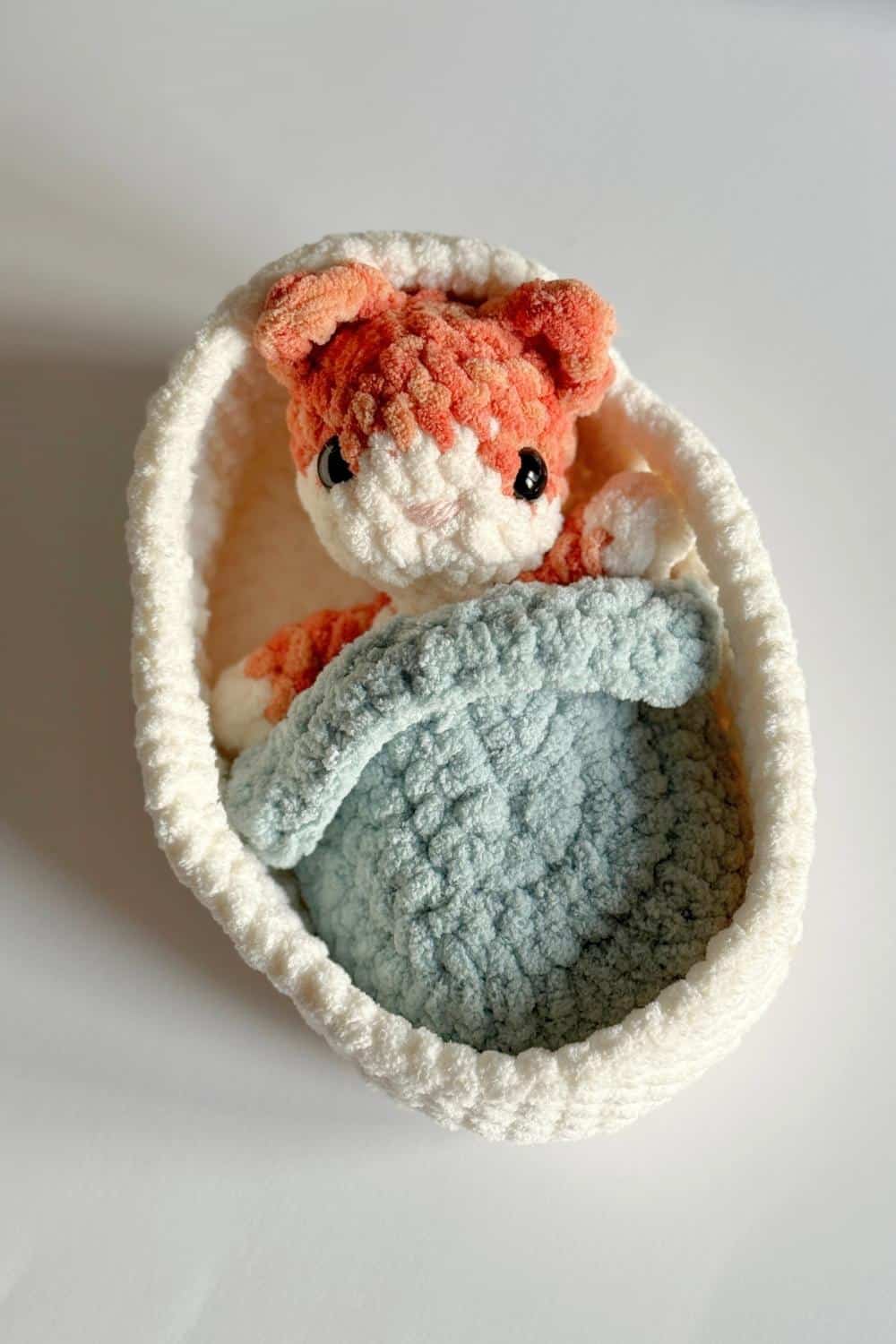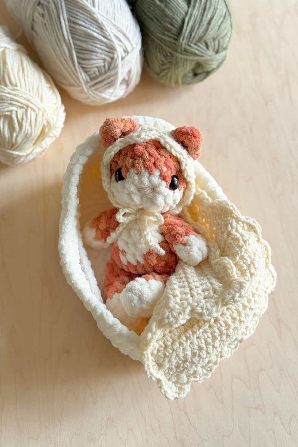 Pattern includes instructions for Baby Tilly Cat with with three color options – classic, Calico and Siamese cat. Also included is a shawl and Pixie Hat pattern, as well as a separate pattern for a bassinet, blanket and bonnet. This is a great pattern for gifting and perfect for beginner-intermediate crocheters!