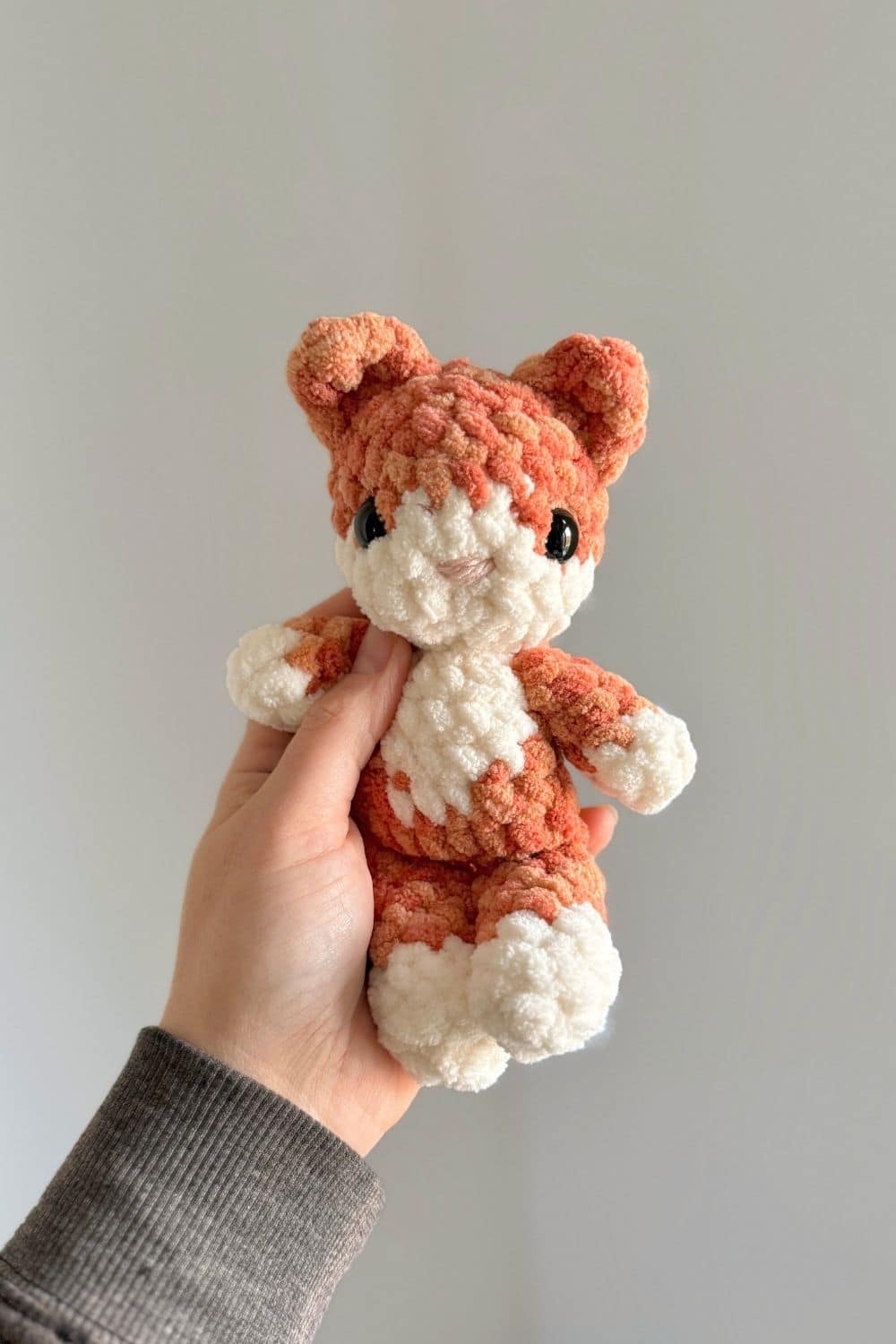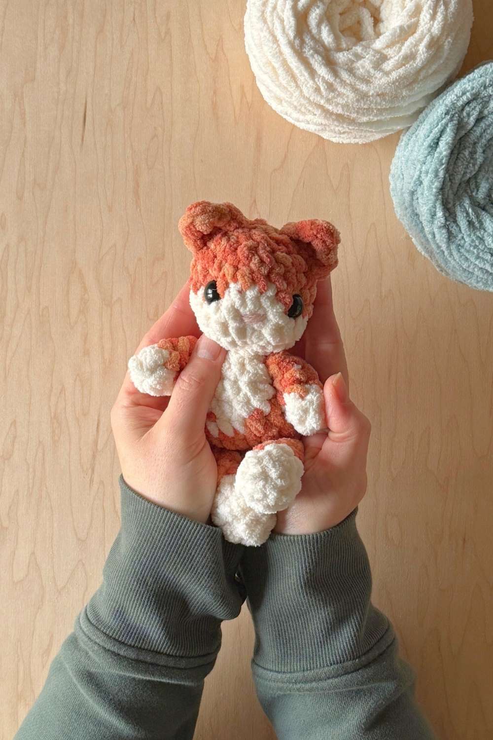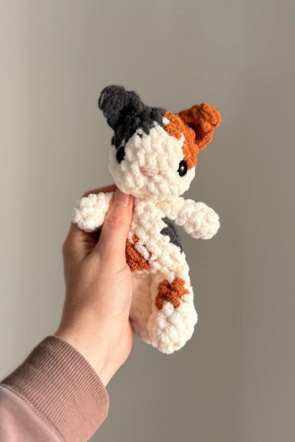 This adorable kitten crochet pattern is perfect for little hands and quick market makes! This pattern is made using plush blanket yarn, creating a soft and huggable finished toy.