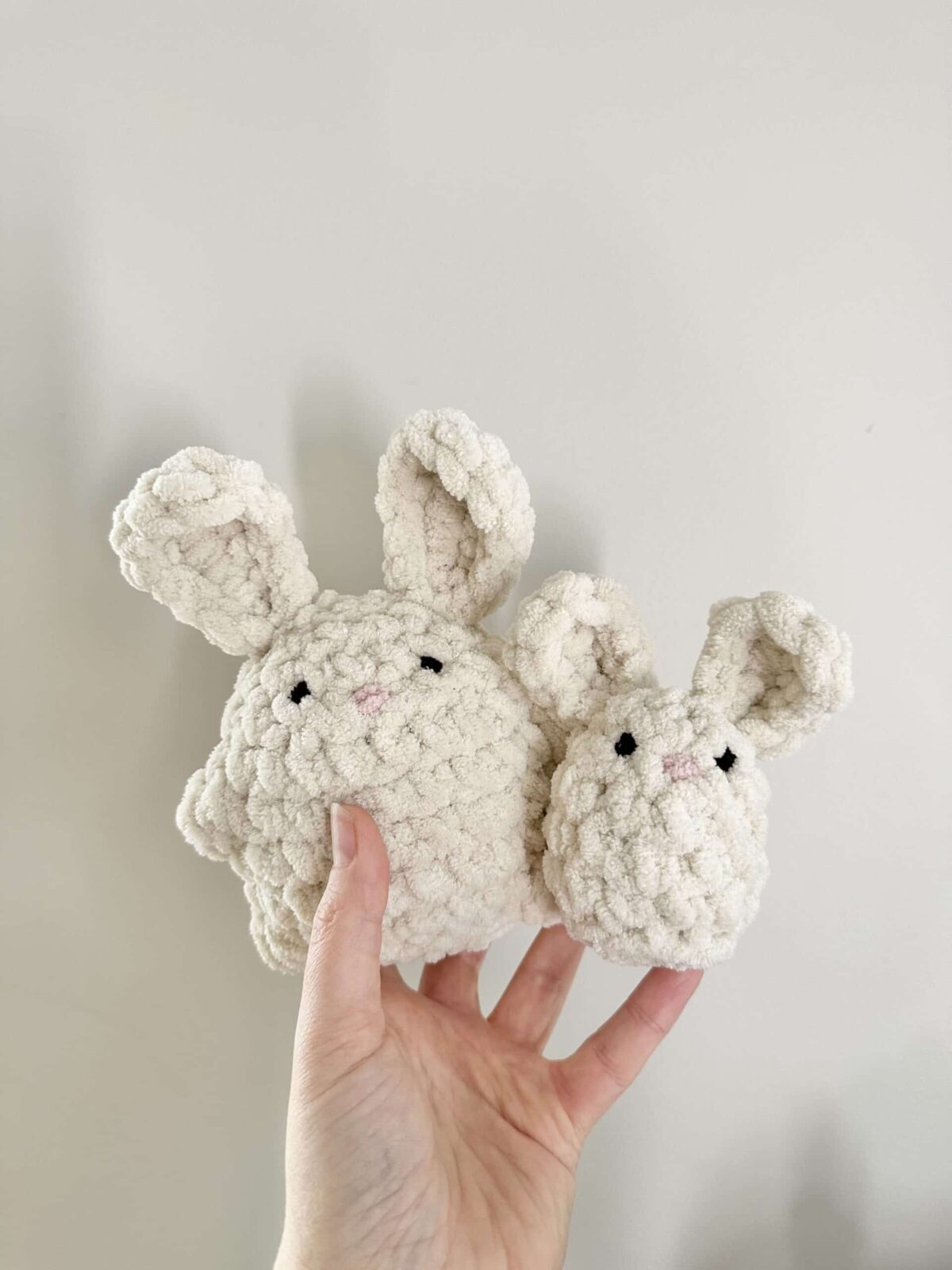 FINISHED SIZE: Larger bunny-approx. 6”/15.2cm, Smaller bunny-approx. 4.5”/11.4cm tall.